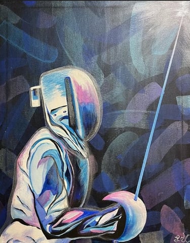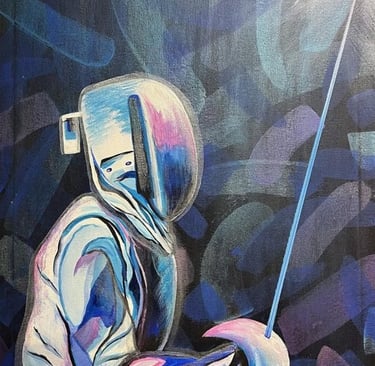 As a former Olympic hopeful training full-time in the World Class Athlete Program (WCAP) for the U.S. Space Force and competing on the world stage for Team USA, I’ve had the unique privilege of living the sport at its most intense. Training during the pandemic was a test of resilience- isolation, limited resources, and adapting to constantly changing conditions were challenging enough, but an Achilles injury ultimately ended my Olympic journey in 2023. Unable to continue fencing, I turned to painting as a way to process and heal, but this shift also revealed fascinating parallels between the two disciplines of art and fencing.